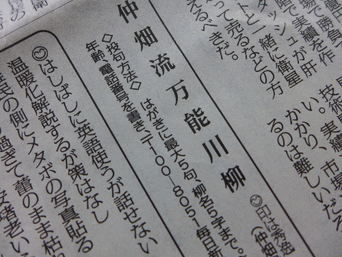 はしばしに英語使うが話せない(櫻井誠子) 2013年9月15日付『毎日新聞』の「仲畑流万能川柳」で秀逸に選ばれた作品です。奇しくも私と同じ市に住む人の作品である。 外国語を取り入れて同化することは従来日本語(日・・・