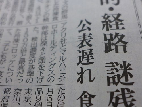 客から異臭の苦情が最初に届いたのが2013年11月中旬だった。その後苦情が広がり、13都府県に渡った。にもかかわらずマルハニチロとアクリフーズが記者会見をしたのは12月29日だった。その日になってようやく商品の自主回収に・・・